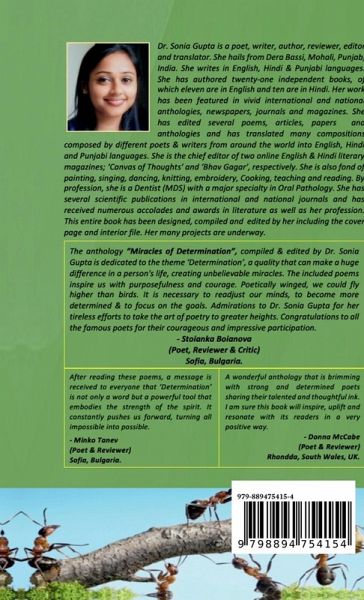 The anthology "Miracles of Determination", compiled & edited by Dr. Sonia Gupta is dedicated to the theme 'Determination', a quality that can make a huge difference in a person's life, creating unbelievable miracles. The poems in the anthology inspire us with purposefulness and courage. Poetically winged, we could fly higher than birds. It is necessary to readjust our minds, to become more determined, to focus on the goals we want to reach. Admirations to Dr. Sonia Gupta for her tireless efforts to take the art of poetry to greater heights. Congratulations also to all the famous international poets for their courageous and impressive participation in this collection. - Stoianka Boianova (Poet, Reviewer & Critic) Sofia, Bulgaria.