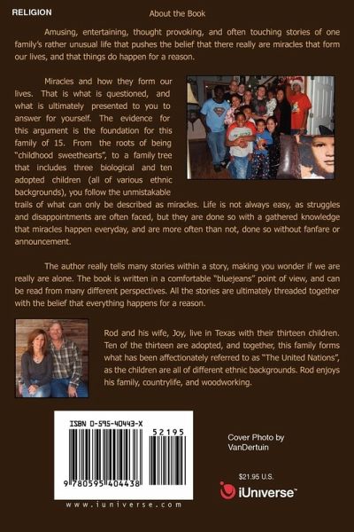 About the Book Amusing, entertaining, thought provoking, and often touching stories of one family's rather unusual life that pushes the belief that there really are miracles that form our lives, and that things do happen for a reason. Miracles and how they form our lives. That is what is questioned, and what is ultimately presented to you to answer for yourself. The evidence for this argument is the foundation for this family of 15. From the roots of being "childhood sweethearts", to a family tree that includes three biological and ten adopted children (all of various ethnic backgrounds), you follow the unmistakable trails of what can only be described as miracles. Life is not always easy, as struggles and disappointments are often faced, but they are done so with a gathered knowledge that miracles happen everyday, and are more often than not, done so without fanfare or announcement. The author really tells many stories within a story, making you wonder if we are really are alone. The book is written in a comfortable "bluejeans" point of view, and can be read from many different perspectives. All the stories are ultimately threaded together with the belief that everything happens for a reason.
