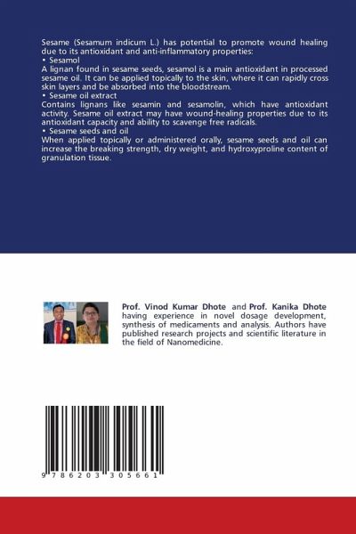 Sesame (Sesamum indicum L.) has potential to promote wound healing due to its antioxidant and anti-inflammatory properties: - SesamolA lignan found in sesame seeds, sesamol is a main antioxidant in processed sesame oil. It can be applied topically to the skin, where it can rapidly cross skin layers and be absorbed into the bloodstream. - Sesame oil extractContains lignans like sesamin and sesamolin, which have antioxidant activity. Sesame oil extract may have wound-healing properties due to its antioxidant capacity and ability to scavenge free radicals. - Sesame seeds and oilWhen applied topically or administered orally, sesame seeds and oil can increase the breaking strength, dry weight, and hydroxyproline content of granulation tissue.
