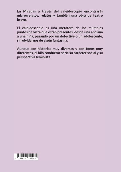 En Miradas a través del caleidoscopio encontrarás microrrelatos, relatos y también una obra de teatro breve. El caleidoscopio es una metáfora de los múltiples puntos de vista que están presentes, desde una anciana a una niña, pasando por un detective o un adolescente, sin olvidarnos de algún fantasma. Aunque son historias muy diversas y con tonos muy diferentes, el hilo conductor sería su carácter social y su perspectiva feminista.