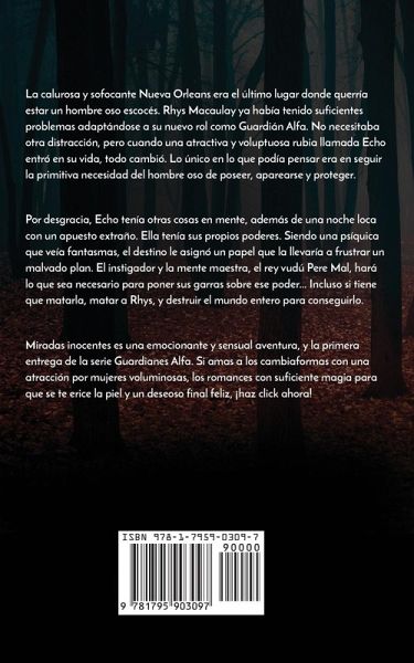 La calurosa y sofocante Nueva Orleans era el último lugar donde querría estar un hombre oso escocés. Rhys Macaulay ya había tenido suficientes problemas adaptándose a su nuevo rol como Guardián Alfa. No necesitaba otra distracción, pero cuando una atractiva y voluptuosa rubia llamada Echo entró en su vida, todo cambió. Lo único en lo que podía pensar era en seguir la primitiva necesidad del hombre oso de poseer, aparearse y proteger. Por desgracia, Echo tenía otras cosas en mente, además de una noche loca con un apuesto extraño. Ella tenía sus propios poderes. Siendo una psíquica que veía fantasmas, el destino le asignó un papel que la llevaría a frustrar un malvado plan. El instigador y la mente maestra, el rey vudú Pere Mal, hará lo que sea necesario para poner sus garras sobre ese poder... Incluso si tiene que matarla, matar a Rhys, y destruir el mundo entero para conseguirlo. Miradas inocentes es una emocionante y sensual aventura, y la primera entrega de la serie Guardianes Alfa.