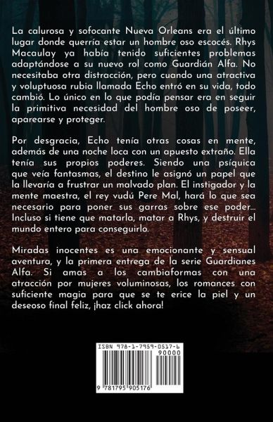 La calurosa y sofocante Nueva Orleans era el último lugar donde querría estar un hombre oso escocés. Rhys Macaulay ya había tenido suficientes problemas adaptándose a su nuevo rol como Guardián Alfa. No necesitaba otra distracción, pero cuando una atractiva y voluptuosa rubia llamada Echo entró en su vida, todo cambió. Lo único en lo que podía pensar era en seguir la primitiva necesidad del hombre oso de poseer, aparearse y proteger. Por desgracia, Echo tenía otras cosas en mente, además de una noche loca con un apuesto extraño. Ella tenía sus propios poderes. Siendo una psíquica que veía fantasmas, el destino le asignó un papel que la llevaría a frustrar un malvado plan. El instigador y la mente maestra, el rey vudú Pere Mal, hará lo que sea necesario para poner sus garras sobre ese poder... Incluso si tiene que matarla, matar a Rhys, y destruir el mundo entero para conseguirlo. Miradas inocentes es una emocionante y sensual aventura, y la primera entrega de la serie Guardianes Alfa. Si amas a los cambiaformas con una atracción por mujeres voluminosas, los romances con suficiente magia para que se te erice la piel y un deseoso final feliz, ¡haz click ahora!