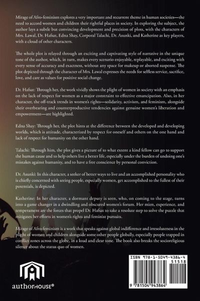 Mirage of Afro-feminism explores a very important and recurrent theme in human societies-the need to accord women and children their rightful places in society. In exploring the subject, the author lays a subtle but convincing development and precision of plots, with the characters of Mrs. Lawal, Dr. Hafsat, Edna Shay, Corporal Talachi, Dr. Asunki, and Katherine as key players, with a cloud of other characters. The whole plot is relayed through an exciting and captivating style of narrative in the unique tone of the author, which, in turn, makes every scenario enjoyable, replayable, and exciting with every sense of accuracy and exactness, without any space for makeup or aborted suspense. The plot depicted through the character of Mrs. Lawal expresses the needs for selfless service, sacrifice, love, and care as values for positive social change. Dr. Hafsat: Through her, the work vividly shows the plight of women in society with an emphasis on the lack of respect for women as a major constraint to effective emancipation. Also, in her character, the off-track trends in women's rights-solidarity, activism, and feminism, alongside their overbearing and counterproductive tendencies against genuine women's liberation and empowerment-are highlighted. Edna Shay: Through her, the plot hints at the difference between the developed and developing worlds, which is attitude, characterized by respect for oneself and others on the one hand and lack of respect for humanity on the other hand. Talachi: Through him, the plot gives a picture of to what extent a kind fellow can go to support the human cause and to help others live a better life, especially under the burden of undoing one's mistakes against humanity, and to have a free conscience by personal conviction. Dr. Asunki: In this character, a seeker of better ways to live and an accomplished personality who is chiefly concerned with seeing people, especially women, get accomplished to the fullest of their potentials, is depicted. Katherine: In her character, a dormant deputy is seen, who, on coming to the stage, turns into a game changer in a dwindling and obscured women's forum. Her mien, experience, and temperament are the forces that propel Dr. Hafsat to take a resolute step to solve the puzzle that mitigates her efforts in women's rights and feminist pursuits. Mirage of Afro-feminism is a work that speaks against global indifference and irresoluteness in the plight of women and children alongside some other people globally, especially people trapped in conflict zones across the globe, in a loud and clear tone. The book also breaks the socioreligious silence about the status quo of women.