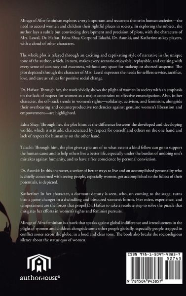 Mirage of Afro-feminism explores a very important and recurrent theme in human societies-the need to accord women and children their rightful places in society. In exploring the subject, the author lays a subtle but convincing development and precision of plots, with the characters of Mrs. Lawal, Dr. Hafsat, Edna Shay, Corporal Talachi, Dr. Asunki, and Katherine as key players, with a cloud of other characters. The whole plot is relayed through an exciting and captivating style of narrative in the unique tone of the author, which, in turn, makes every scenario enjoyable, replayable, and exciting with every sense of accuracy and exactness, without any space for makeup or aborted suspense. The plot depicted through the character of Mrs. Lawal expresses the needs for selfless service, sacrifice, love, and care as values for positive social change. Dr. Hafsat: Through her, the work vividly shows the plight of women in society with an emphasis on the lack of respect for women as a major constraint to effective emancipation. Also, in her character, the off-track trends in women's rights-solidarity, activism, and feminism, alongside their overbearing and counterproductive tendencies against genuine women's liberation and empowerment-are highlighted. Edna Shay: Through her, the plot hints at the difference between the developed and developing worlds, which is attitude, characterized by respect for oneself and others on the one hand and lack of respect for humanity on the other hand. Talachi: Through him, the plot gives a picture of to what extent a kind fellow can go to support the human cause and to help others live a better life, especially under the burden of undoing one's mistakes against humanity, and to have a free conscience by personal conviction. Dr. Asunki: In this character, a seeker of better ways to live and an accomplished personality who is chiefly concerned with seeing people, especially women, get accomplished to the fullest of their potentials, is depicted. Katherine: In her character, a dormant deputy is seen, who, on coming to the stage, turns into a game changer in a dwindling and obscured women's forum. Her mien, experience, and temperament are the forces that propel Dr. Hafsat to take a resolute step to solve the puzzle that mitigates her efforts in women's rights and feminist pursuits. Mirage of Afro-feminism is a work that speaks against global indifference and irresoluteness in the plight of women and children alongside some other people globally, especially people trapped in conflict zones across the globe, in a loud and clear tone. The book also breaks the socioreligious silence about the status quo of women.