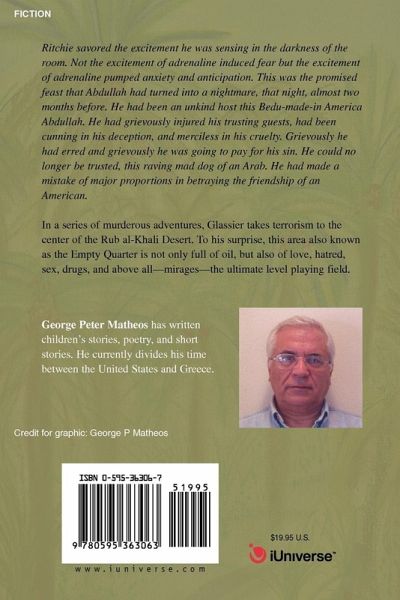 Ritchie savored the excitement he was sensing in the darkness of the room. Not the excitement of adrenaline induced fear but the excitement of adrenaline pumped anxiety and anticipation. This was the promised feast that Abdullah had turned into a nightmare, that night, almost two months before. He had been an unkind host this Bedu-made-in America Abdullah. He had grievously injured his trusting guests, had been cunning in his deception, and merciless in his cruelty. Grievously he had erred and grievously he was going to pay for his sin. He could no longer be trusted, this raving mad dog of an Arab. He had made a mistake of major proportions in betraying the friendship of an American. It took Richard Gephard Glassier less than one minute to blow the brains out of each of the officers of the Soilco Oil Company Executive Committee of Saudi Arabia. Introduced to the vast oil riches of Saudi Arabia during the Gulf War, all he wanted was to hook up with a prince for a piece of the action. In a series of murderous adventures, Glassier takes terrorism to the center of the Rub al-Khali Desert. To his surprise, this area also known as the Empty Quarter is not only full of oil, but also of love, hatred, sex, drugs, and above all-mirages-the ultimate level playing field.