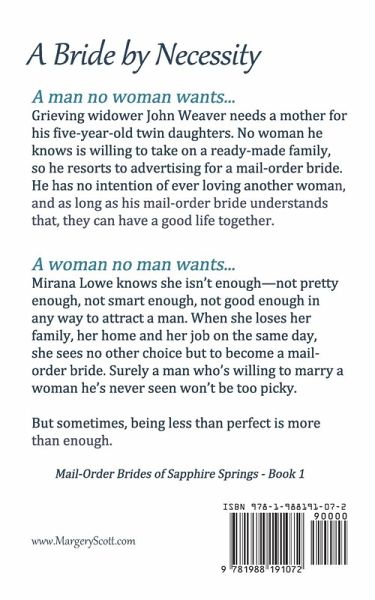 John Weaver doesn't want a wife...he needs one. He needs a mother for his five-year-old twin daughters, and his only choice is to advertise for a mail-order bride. As long as the woman understands he'll never love her, they can have a good life together. Miranda Lowe doesn't want a husband...she needs one. She isn't enough-not pretty enough, not smart enough, not good enough in any way to attract a man herself, but surely a man who has to advertise for a wife won't be too choosy. The question is, can being less than perfect be more than enough?
