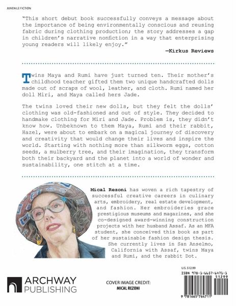 Twins Maya and Rumi have just turned ten. Their mother's childhood teacher gifted them two unique handcrafted dolls made out of scraps of wool, leather, and cloth. Rumi named her doll Miri, and Maya called hers Jade. The twins loved their new dolls, but they felt the dolls' clothing was old-fashioned and out of style. They decided to handmake clothing for Miri and Jade. Problem is, they didn't know how. Unbeknown to them Maya, Rumi and their rabbit, Hazel, were about to embark on a magical journey of discovery and creativity that would change their lives and inspire the world. Starting with nothing more than silkworm eggs, cotton seeds, a mulberry tree, and their imagination, they transform both their backyard and the planet into a world of wonder and sustainability, one stitch at a time.