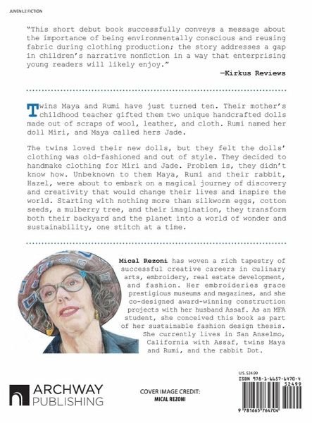 Twins Maya and Rumi have just turned ten. Their mother's childhood teacher gifted them two unique handcrafted dolls made out of scraps of wool, leather, and cloth. Rumi named her doll Miri, and Maya called hers Jade. The twins loved their new dolls, but they felt the dolls' clothing was old-fashioned and out of style. They decided to handmake clothing for Miri and Jade. Problem is, they didn't know how. Unbeknown to them Maya, Rumi and their rabbit, Hazel, were about to embark on a magical journey of discovery and creativity that would change their lives and inspire the world. Starting with nothing more than silkworm eggs, cotton seeds, a mulberry tree, and their imagination, they transform both their backyard and the planet into a world of wonder and sustainability, one stitch at a time.
