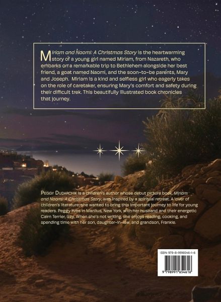Miriam and Naomi: A Christmas Story is the heartwarming story of a young girl named Miriam, from Nazareth, who embarks on a remarkable trip to Bethlehem alongside her best friend, a goat named Naomi, and the soon-to-be parents, Mary and Joseph. Miriam is a kind and selfless girl who eagerly takes on the role of caretaker, ensuring Mary's comfort and safety during their difficult trek. This beautifully illustrated book chronicles that journey.