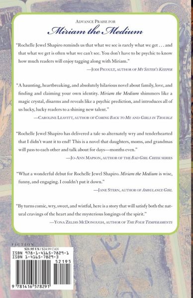 In the tradition of Susan Isaacs comes a charming debut novel featuring a lovable phone psychic, whose talents will either save her family from financial ruin -- or ruin her family altogether. What do you do when your husband's business is failing, your daughter is ashamed of you, and your faith in your own talents hits rock bottom? Miriam is a modern-day Long Island housewife, who just happens to be a professional phone psychic. But while she can heal broken hearts, mend relationships, and help others find new careers, her own life is in shambles. It starts with the family business. Her husband, Rory, is working every spare minute to keep his business, Mirror Pharmacy, afloat, but no matter what cost-saving measures he takes, a profit seems farther and farther away. Using her gift, Miriam tries to channel to the heart of the problem, but Rory's patience with her "readings" has worn as thin as his cash flow. Then there is Miriam's teenage daughter, Cara, who cannot stand to be in the same room with her, much less listen to any psychically generated advice. Now involved with a particularly bad-news boyfriend, she's too in love to take Miriam's warnings seriously. Miriam struggles to maintain a positive outlook -- things are bad, but they can always be worse, goes her mantra. So when a persistent agent proclaims her talents remarkable and marketable, Miriam decides to take action. But will going public ruin her family's already questionable standing in their prim Long Island community? And will her trusted spirits -- her dear departed Dad and Russian grandmother, Bubbie -- remain faithful if she "sells out"? Miriam struggles to sort through her escalating troubles and trust her abilities in times of crisis, even as her visions are becoming too cloudy to interpret. In a quirky tale full of humor and heartache, Rochelle Shapiro captures the universal desire to find one's true self, no matter the opinions of others. Smart and sassy, Miriam the Medium is the debut of a talented and imaginative author -- one who is able to conjure with words and spirit.