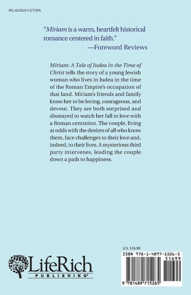 Miriam: A Tale of Judea in the Time of Christ tells the story of a young Jewish woman who lives in Judea in the time of the Roman Empire's occupation of that land. Miriam's friends and family know her to be loving, courageous, and devout. They are both surprised and dismayed to watch her fall in love with a Roman centurion. The couple, living at odds with the desires of all who know them, face challenges to their love and, indeed, to their lives. A mysterious third party intervenes, leading the couple down a path to happiness.