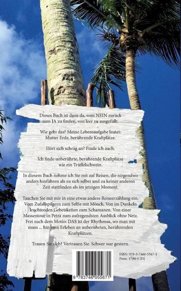 Dieses Buch ist für Menschen, die alles haben: Eine schöne Wohnung, eine geregelte Arbeit, einen mehr oder minder routinierten Terminplan mit einmal Sport die Woche, vielleicht sogar Yoga und eine feste Vorstellung, wie alles zu sein hat.Also für Menschen, denen es so richtig gut geht. Oder?Sie funktionieren gut und das Einzige, was Ihnen zu sich einfällt, ist: Ich funktioniere gut, aber ist das jetzt alles?Dieses Buch ist dazu da, vom Nein zurück zum JA zu finden, von leer zu ausgefüllt.Wie geht das?Die Lebensaufgabe von Mirja Geertz lautet:Mutter Erde, berührende Kraftplätze.Hört sich schräg an? Findet sie auch. Aber, Mirja findet unberührte, berührende Kraftplätze wie ein Trüffelschwein.In diesem Buch nimmt sie Sie mit auf Reisen, die nirgendwo anders enden als nur bei sich selbst und zu keiner anderen Zeit stattfinden als im jetzigen Moment.Folgen Sie ihr in eine etwas andere Reiseerzählung. Vom Zufallspilgern zum Selfie mit Mönch. Von im Dunkeln leuchtenden Gebetsketten zum Schamanen. Vom Kuhhirten auf einem Kathedralendach zum Equinox in einem der Sieben Weltwunder. Von einer Massentour in Petra zum aufregendsten Ausblick ohne Netz, frei nach dem Motto: DAS ist der Rhythmus, wo man mit muss ... hin zum Erleben an unberührten, berührenden Kraftplätzen.Trauen Sie sich? Vertrauen Sie. Schwer war gestern.
