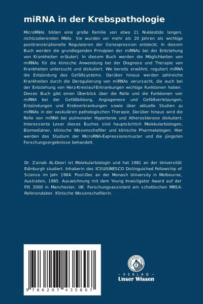 MicroRNAs bilden eine große Familie von etwa 21 Nukleotide langen, nichtcodierenden RNAs. Sie wurden vor mehr als 20 Jahren als wichtige posttranskriptionelle Regulatoren der Genexpression entdeckt. In diesem Buch werden die grundlegenden Prinzipien der miRNAs bei der Entstehung von Krankheiten erläutert. In diesem Buch werden die Möglichkeiten von miRNAs für die klinische Anwendung bei der Diagnose und Therapie von Krankheiten untersucht und diskutiert. Wie bereits erwähnt, reguliert miRNA die Entzündung des Gefäßsystems. Darüber hinaus werden zahlreiche Krankheiten durch die Deregulierung von miRNAs verursacht, die auch bei der Entstehung von Herz-Kreislauf-Erkrankungen wichtige Funktionen haben. Dieses Buch gibt einen Überblick über die Rolle und die Funktionen von miRNA bei der Gefäßbildung, Angiogenese und Gefäßverletzungen, Entzündungen und Krebserkrankungen sowie über aktuelle Studien zu miRNAs in der vaskulären pathologischen Therapie. Darüber hinaus wird die Rolle von miRNA bei pulmonaler Hypertonie und Atherosklerose diskutiert. Interessierte Leser dieses Buches sind hauptsächlich Molekularbiologen, Biomediziner, klinische Wissenschaftler und klinische Pharmakologen. Hier werden das Studium der MicroRNA-Expressionsmuster und die jüngsten Forschungsergebnisse behandelt.