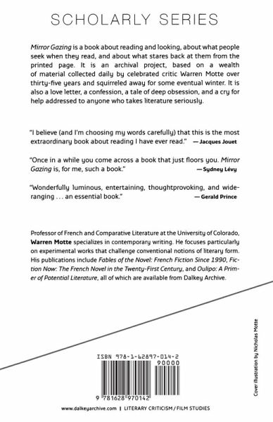 Mirror Gazing is a book about reading and looking, about what people seek when they read, and about what stares back at them from the printed page. It is an archival project, based on a wealth of material collected daily by celebrated critic Warren F. Motte over thirty-five years and squirreled away for some eventual winter. It is also a love letter, a confession, a tale of deep obsession, and a cry for help addressed to anyone who takes literature seriously. ¿At heart, this is not just a book about mirror scenes, interesting as they are¿ and they are interesting. It¿s also a look at passion, at collection, at personal taxonomies and the game of creating order from disorder (do we ever win that game?). It¿s about how we read and why we read. And it¿s about the Delphic maxim, ¿Know thyself.¿ Motte explores how characters look for (or suddenly catch) themselves in mirrors, as well as how (or whether) the act of writing is a reflection, distorted or true, of writers themselves.¿¿ Julie Larios, Numero Cinq ¿I believe (and I¿m choosing my words carefully) that this is the most extraordinary book about reading I have ever read¿ ¿ Jacques Jouet ¿Wonderfully luminous, entertaining, thought-provoking, and wide-ranging¿an essential book¿ ¿ Gerald Prince ¿Motte has collected around ten thousand mirror scenes from roughly 1,500 books. This, in and of itself, is noteworthy, but the book is not simply a reprinting of quotes from various books. It is a deeply considered analysis of what it actually means to look into a mirror. For the serious reader, this book will serve as a trip through your reading past. I was reminded¿somewhat nostalgically¿of much of the literature that has defined the early part of my adult life. From Nabokov to Salinger to Rilke to Calvino, the book makes its way into just about every corner of American and European literature.¿ ¿ Nancy Smith, YourImpossibleVoice