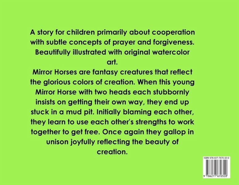 Picture book with main theme of cooperation, and subtle themes of forgiveness, prayer, and faith. Beautiful original watercolor art.Mirror horses are fantasy horse that reflect the colors of creation. Caregiver guide included.