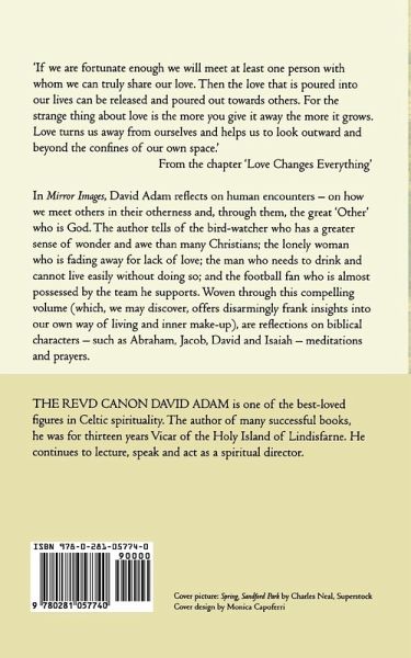 In Mirror Images, David Adam reflects on human encounters - on how we meet others in their otherness and through them the great 'Other' who is God. Characters in the book include the bird-watcher who has a greater sense of wonder and awe than many who call themselves Christian; the 'Snow White' woman who is fading away for lack of love; the man who needs to drink and cannot live easily without doing so, and the fan who is almost possessed by the team he supports. Each chapter ends with a look at a biblical character (Abraham, Jacob, David and Isaiah are among those featured), who has something to teach us about ourselves and our inner make-up. We will then be able to reflect further on our own way of living and how other people may see us. "If we are fortunate enough we will meet at least one person with whom we can truly share our love. Then the love that is poured into our lives can be released and poured out towards others. For the strange thing about love is the more you give it away the more it grows. Love turns us away from ourselves and helps us to look outward and beyond the confines of our own space." From 'Love Changes Everything'