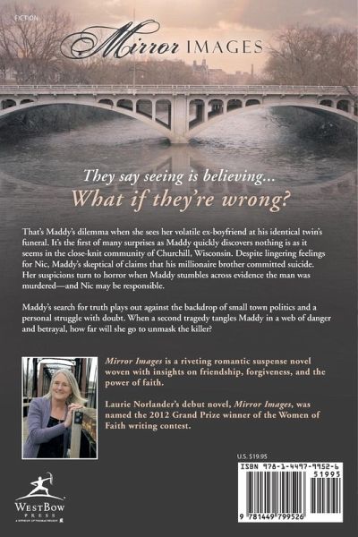 They say seeing is believing... What if they’re wrong? That’s Maddy’s dilemma when she sees her volatile ex-boyfriend at his identical twin’s funeral. It’s the first of many surprises as Maddy quickly discovers nothing is as it seems in the close-knit community of Churchill, Wisconsin. Despite lingering feelings for Nic, Maddy’s skeptical of claims that his millionaire brother committed suicide. Her suspicions turn to horror when Maddy stumbles across evidence the man was murdered—and Nic may be responsible. Maddy’s search for truth plays out against the backdrop of small town politics and a personal struggle with doubt. When a second tragedy tangles Maddy in a web of danger and betrayal, how far will she go to unmask the killer? Mirror Images is a riveting romantic suspense novel woven with insights on friendship, forgiveness, and the power of faith. Laurie Norlander’s debut novel, Mirror Images, was named the 2012 Grand Prize winner of the Women of Faith writing contest.