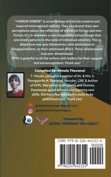 "MIRROR MIRROR" is an anthology written by creative and inspired international authors. They expressed their own perceptions about the reflection of mirrors in fiction and non-fiction. It's in-between a real image and a virtual image that one mind captures in the state of individual emotion. This is about how one sees themselves, with admiration or disappointment, as their emotional affect. Three-dimensional into one-dimensional. GVPL is grateful to all the writers and readers for their support and encouragement. Thank you!