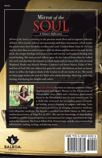 Mirror of the Soul is a reference to the precious metal silver and its superior reflective abilities. Silver jewelry reflects one's personality and silver instruments, which render the purest tones, have the ability to reflect one's soul. Classical flutist Tania M. DeVizia uses her silver flute as a tool to connect with the divine and thus mirror her soul. In this book, she merges theology and science, time and eternity and hands-on healing with sound healing. She analyzes and reflects upon the five roles of Jesus when he walked this earth and describes the manner in which music and art mirror His roles of Good Shepherd, Healer and Miracle Worker, Carpenter and Stone Mason, Fisher of Men and Son of God. Her text reflects her quest for truth. She believes we have an innate desire to reflect the highest ideals of the Creator in all our works of art. The words on these pages mirror the soul of a flutist who enjoys listening, observing, analyzing, hearing, and sharing her insights with others.