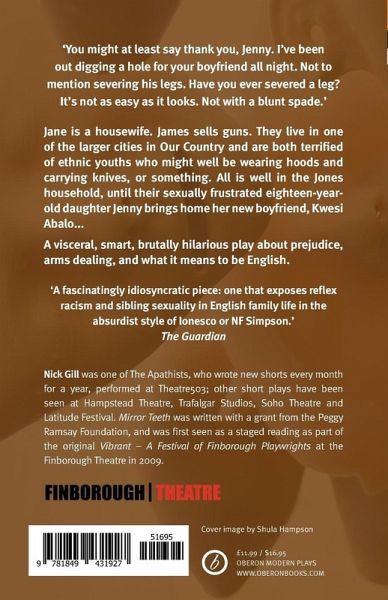 "You might at least say thank you, Jenny. I've been out digging a hole for your boyfriend all night. Not to mention severing his legs. Have you ever severed a leg? It's not as easy as it looks. Not with a blunt spade." Jane is a housewife. James sells guns. They live in one of the larger cities in Our Country and are both terrified of ethnic youths who might well be wearing hoods and carrying knives,or something. All is well in the Jones household, until their sexually frustrated eighteen-year-old daughter Jenny brings home her new boyfriend, Kwesi Abalo... A visceral, smart, brutally hilarious play about prejudice, arms dealing, and what it means to be English. Nominated for four Off West End Awards Best Director - Kate Wasserberg Best Female performance - Louise Collins Most Promising Playwright - Nick Gill Best New Play