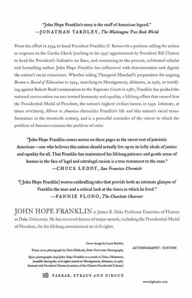 John Hope Franklin lived through America's most defining twentieth-century transformation, the dismantling of legally protected racial segregation. A renowned scholar, he has explored that transformation in its myriad aspects, notably in his 3.5-million-copy bestseller, From Slavery to Freedom. Born in 1915, he, like every other African American, could not help but participate: he was evicted from whites-only train cars, confined to segregated schools, threatened-once with lynching-and consistently subjected to racism's denigration of his humanity. Yet he managed to receive a Ph.D. from Harvard; become the first black historian to assume a full professorship at a white institution, Brooklyn College; and be appointed chair of the University of Chicago's history department and, later, John B. Duke Professor at Duke University. He has reshaped the way African American history is understood and taught and become one of the world's most celebrated historians, garnering over 130 honorary degrees. But Franklin's participation was much more fundamental than that. From his effort in 1934 to hand President Franklin Roosevelt a petition calling for action in response to the Cordie Cheek lynching, to his 1997 appointment by President Clinton to head the President's Initiative on Race, and continuing to the present, Franklin has influenced with determination and dignity the nation's racial conscience. Whether aiding Thurgood Marshall's preparation for arguing Brown v. Board of Education in 1954, marching to Montgomery, Alabama, in 1965, or testifying against Robert Bork's nomination to the Supreme Court in 1987, Franklin has pushed the national conversation on race toward humanity and equality, a life long effort that earned him the Presidential Medal of Freedom, the nation's highest civilian honor, in 1995. Intimate, at times revelatory, Mirror to America chronicles Franklin's life and this nation's racial transformation in the twentieth century, and is a powerful reminder of the extent to which the problem of America remains the problem of color.