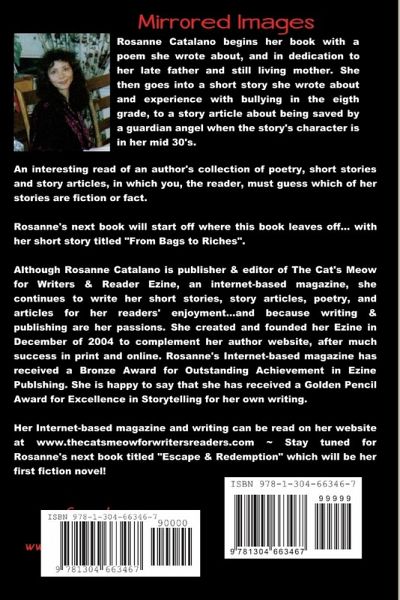Mirrored Images by Rosanne Catalano begins with a poem about, and dedication to, her late father and still-living mother. It then goes into a short story she wrote about an experience with bullying in the eighth grade of school to a story about being saved by a guardian angel when the story's character is in her mid 30's to another short story about a little boy who is abandoned by his mother when she starts dating a man who doesn't like children to yet another short story about how the author and her husband of 16 years met and fell in love to yet another short story about Christmas with her grandmother... The author shares ten of her short stories and two of her poems with you. An interesting read in which you may want to guess which of the short stories are fiction or fact. Rosanne's next book is titled 'Escape & Redemption,' but it will be a crime fiction novel that will start off where this book leaves off with her short story titled "From Bags to Riches".
