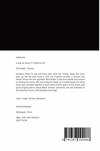 MIRRORS by Azure D. Osborne-Lee. A rich, poetic, spine-tingling play about Black women, queerness, the madness and sadness of the American South and everyday hauntings. When 17 year-old Alma Jean finds her mother dead, she must pack up her life and move in with her mother's ex-lover, a woman she doesn't know. Her new guardian, Bird Wilson, is the town pariah and unused to sharing her home. Will mourning the death of a shared loved one bring Alma Jean and Bird together or push them further apart? This book is a NoPassport Press edition.