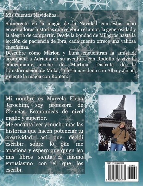 Mis Cuentos Navideños: Libro personalizable. Historias mágicas para una Navidad inolvidable Puedes personalizar el libro con tu puño y letra en la primera página del libro para que siempre quede el recuerdo, indicando el nombre de ese niño/a especial, tu nombre y una bella dedicatoria ¡Descubre la magia de la Navidad con Mis Cuentos Navideños! Este encantador libro reúne ocho historias que capturan el verdadero espíritu navideño, llenas de amor, generosidad y momentos inolvidables. * La Navidad Inolvidable de Milagros: Una niña que aprende que la verdadera felicidad está en compartir. * El Secreto de Ibra: Un niño curioso que descubre la importancia de la paciencia y la responsabilidad. * El Regalo de Navidad de Marlon y Luna: Dos hermanos que encuentran la amistad a través de un único regalo. * Adriana y el Reno: Una obra de teatro escolar que se salva gracias a la magia de Rodolfo. * La Aventura de Navidad de Martina: Una emocionante noche en la que Martina conoce a Papá Noel. * El Regalo de Moka: La transformación de un niño travieso que aprende a respetar a los demás. * La Feria Navideña de Alba y Josué: Dos amigos inseparables que descubren la alegría de compartir. * La Magia de Navidad de Román: Un muñeco de nieve que cobra vida para demostrar que los regalos más valiosos son los que nacen del corazón. Cada cuento es una celebración de la Navidad, perfecta para leer en familia y crear recuerdos que durarán toda la vida. ¡No te pierdas estas historias llenas de magia y enseñanzas que harán de tu Navidad algo verdaderamente especial!