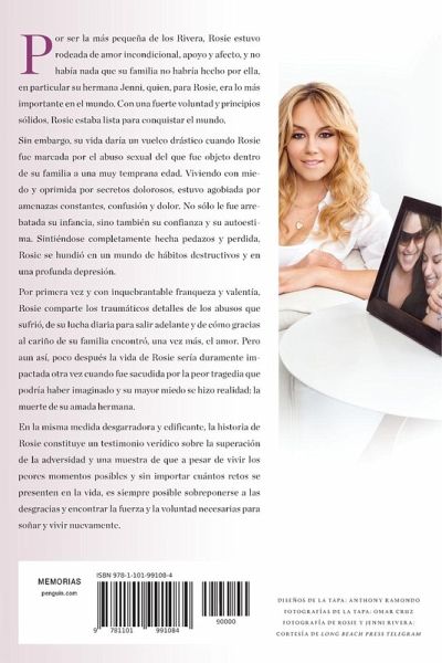 Por ser la más pequeña de los Rivera, Rosie estuvo rodeada de amor incondicional, apoyo y afecto, y no había nada que su familia no habría hecho por ella, en particular su hermana Jenni, quien, para Rosie, era lo más importante en el mundo. Con una fuerte voluntad y principios sólidos, Rosie estaba lista para conquistar el mundo. Sin embargo, su vida daría un vuelco drástico cuando Rosie fue marcada por el abuso sexual del que fue objeto dentro de su familia a una muy temprana edad. Viviendo con miedo y oprimida por secretos dolorosos, estuvo agobiada por amenazas constantes, confusión y dolor. No sólo le fue arrebatada su infancia, sino también su confianza y su autoestima. Sintiéndose completamente hecha pedazos y perdida, Rosie se hundió en un mundo de hábitos destructivos y en una profunda depresión. Por primera vez y con inquebrantable franqueza y valentía, Rosie comparte los traumáticos detalles de los abusos que sufrió, de su lucha diaria para salir adelante y de cómo gracias al cariño de su familia encontró, una vez más, el amor. Pero aún así, poco después la vida de Rosie sería duramente impactada otra vez cuando fue sacudida por la peor tragedia que podría haber imaginado y su más mayor miedo se hizo realidad: la muerte de su amada hermana. En la misma medida desgarradora y edificante, la historia de Rosie constituye un testimonio verídico sobre la superación de la adversidad y una muestra de que a pesar de vivir los peores momentos posibles y sin importar cuántos retos se presenten en la vida, es siempre posible sobreponerse a las desgracias y encontrar la fuerza y la voluntad necesarias para soñar y vivir nuevamente. CON FOTOGRAFÍAS Prólogo de Mryka Dellanos.