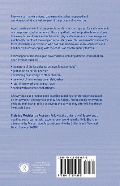 Approximately one in four pregnancies ends in miscarriage but for each woman the experience is unique. This sympathetic and helpful book explores the many different ways in which women physically experience miscarriage and emotionally react to it. Drawing on the experiences of over 350 women, it will help every woman who has miscarried make sense of her loss and find her own way of coping with the confusion that frequently follows. Many aspects of miscarriage are covered including difficult issues that are often avoided: * the nature of the loss: tissue, embryo, foetus or baby? * guilt about an earlier abortion * explaining miscarriage to other children * the effect of miscarriage on a relationship * returning to work after miscarriage * coping with repeated miscarriages. The text also provides a set of guidelines to good practice for professionals, based on what women say they find helpful. Professionals who want to evaluate their own practice or develop the service they offer will find this an invaluable reference.