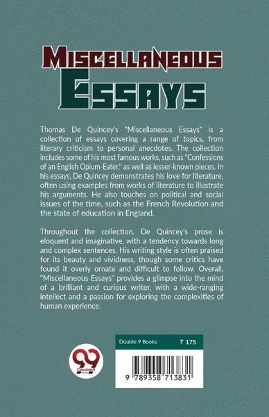 Thomas De Quincey's "Miscellaneous Essays" is a collection of essays covering a range of topics, from literary criticism to personal anecdotes. The collection includes some of his most famous works, such as "Confessions of an English Opium-Eater," as well as lesser-known pieces. In his essays, De Quincey demonstrates his love for literature, often using examples from works of literature to illustrate his arguments. He also touches on political and social issues of the time, such as the French Revolution and the state of education in England. Throughout the collection, De Quincey's prose is eloquent and imaginative, with a tendency towards long and complex sentences. His writing style is often praised for its beauty and vividness, though some critics have found it overly ornate and difficult to follow. Overall, "Miscellaneous Essays" provides a glimpse into the mind of a brilliant and curious writer, with a wide-ranging intellect and a passion for exploring the complexities of human experience.
