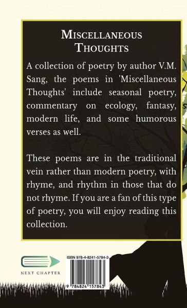 A collection of poetry by author V.M. Sang, the poems in 'Miscellaneous Thoughts' include seasonal poetry, commentary on ecology, fantasy, modern life, and some humorous verses as well. These poems are in the traditional vein rather than modern poetry, with rhyme, and rhythm in those that do not rhyme. If you are a fan of this type of poetry, you will enjoy reading this collection.
