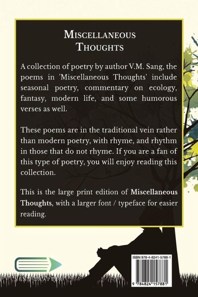 A collection of poetry by author V.M. Sang, the poems in 'Miscellaneous Thoughts' include seasonal poetry, commentary on ecology, fantasy, modern life, and some humorous verses as well. These poems are in the traditional vein rather than modern poetry, with rhyme, and rhythm in those that do not rhyme. If you are a fan of this type of poetry, you will enjoy reading this collection. This is the large print edition of Miscellaneous Thoughts, with a larger font / typeface for easier reading.