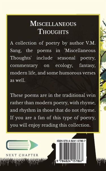 A collection of poetry by author V.M. Sang, the poems in 'Miscellaneous Thoughts' include seasonal poetry, commentary on ecology, fantasy, modern life, and some humorous verses as well. These poems are in the traditional vein rather than modern poetry, with rhyme, and rhythm in those that do not rhyme. If you are a fan of this type of poetry, you will enjoy reading this collection.