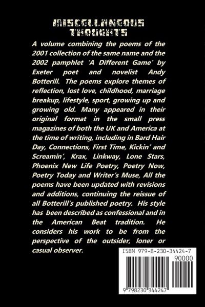 Miscellaneous Thoughts combines the poems of the 2001 full collection of the same name and the 2002 pamphlet A Different Game by Exeter poet and novelist Andy Botterill. The poems explore themes of reflection, lost love, childhood, marriage breakup, lifestyle, sport, growing up and growing old, with an increasing emphasis on use of language as well as conveying a story or message in words. Many appeared in their original format in the small press magazines of both the UK and America at the time of writing, including in Bard Hair Day, Connections, First Time, Kickin' and Screamin', Krax, Linkway, Lone Stars, Phoenix New Life Poetry, Poetry Now, Poetry Today and Writer's Muse, and all the poems have been updated with revisions and additions for this new collection, which continues the gradual reissue of all Andy Botterill's published poetry. His style has been described as confessional and in the American Beat tradition. He considers his work to be from the perspective of the outsider, loner or casual observer.