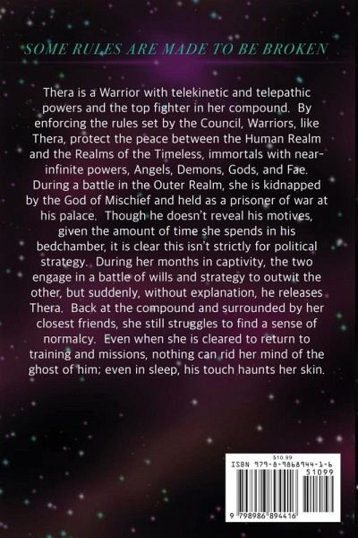 Thera is a Warrior with telekinetic and telepathic powers and the top fighter in her compound. By enforcing the rules set by the Council, Warriors, like Thera, protect the peace between the Human Realm and the Realms of the Timeless, immortals with near-infinite powers, Angels, Demons, Gods, and Fae. During a battle in the Outer Realm, she is kidnapped by the God of Mischief and held as a prisoner of war at his palace. Though he doesn't reveal his motives, given the amount of time she spends in his bedchamber, it is clear this isn't strictly for political strategy. During her months in captivity, the two engage in a battle of wills and strategy to outwit the other, but suddenly, without explanation, he releases Thera. Back at the compound and surrounded by her closest friends, she still struggles to find a sense of normalcy. Even when she is cleared to return to training and missions, nothing can rid her mind of the ghost of him; even in sleep, his touch haunts her skin.