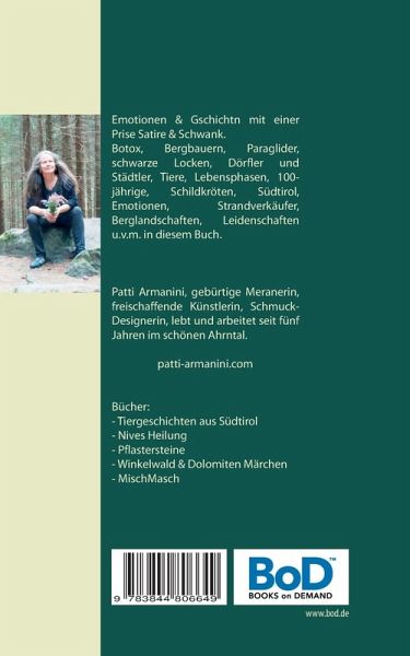 Emotionen & Gschichtn mit einer Prise Satire & Schwank. Über Botox, Bergbauern, Paraglidern, schwarzen Locken, südtirols Bauern, Dörflern und Stadtlern, Tieren und Menschen wird in diesem Buch erzählt, über 100-jährige, Schildkröten, Strandverkäufer, Berglandschaften, Leidenschaften u.v.m. MischMasch...