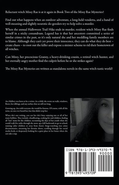 Reluctant witch Missy Rae is at it again in Book Two of the Missy Rae Mysteries! Find out what happens when an outdoor adventure, a long-held vendetta, and a band of well-meaning and slightly neurotic do-gooders try to help solve a murder. When the annual Halloween Trail Hike ends in murder, resident witch Missy Rae finds herself in a sticky conundrum. Legend has it that her ancestors committed a series of similar crimes in the past, so it's only natural she and her meddling family members are to blame. Although they can't yet prove their innocence, they can do what they do best - create chaos - to root out the killer and expose a sinister scheme to rid their hometown of all witches. Can Missy, her precocious Granny, a heavy-drinking cousin, a retired witch hunter, and her eternally angry mother find the culprit before he or she strikes again? The Missy Rae Mysteries are written as standalone novels in the same witch-tastic world!