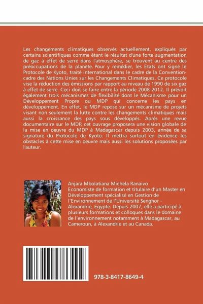 Les changements climatiques observés actuellement, expliqués par certains scientifiques comme étant le résultat d'une forte augmentation de gaz à effet de serre dans l'atmosphère, se trouvent au centre des préoccupations de la planète. Pour y remédier, les Etats ont signé le Protocole de Kyoto, traité international dans le cadre de la Convention-cadre des Nations Unies sur les Changements Climatiques. Ce protocole vise la réduction des émissions par rapport au niveau de 1990 de six gaz à effet de serre. Ceci doit se faire entre la période 2008-2012. Il prévoit également trois mécanismes de flexibilité dont le Mécanisme pour un Développement Propre ou MDP qui concerne les pays en développement. En effet, le MDP repose sur un mécanisme de projets visant non seulement la lutte contre les changements climatiques mais aussi la croissance des pays sous développés. Après une revue documentaire sur le MDP, cet ouvrage proposera une vision globale de la mise en oeuvre du MDP à Madagascar depuis 2003, année de sa signature du Protocole de Kyoto. Il mettra surtout en évidence les obstacles à cette mise en oeuvre mais aussi les solutions proposées par l'auteur.