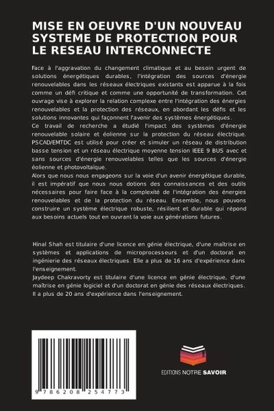 Face à l'aggravation du changement climatique et au besoin urgent de solutions énergétiques durables, l'intégration des sources d'énergie renouvelables dans les réseaux électriques existants est apparue à la fois comme un défi critique et comme une opportunité de transformation. Cet ouvrage vise à explorer la relation complexe entre l'intégration des énergies renouvelables et la protection des réseaux, en abordant les défis et les solutions innovantes qui façonnent l'avenir des systèmes énergétiques.Ce travail de recherche a étudié l'impact des systèmes d'énergie renouvelable solaire et éolienne sur la protection du réseau électrique. PSCAD/EMTDC est utilisé pour créer et simuler un réseau de distribution basse tension et un réseau électrique moyenne tension IEEE 9 BUS avec et sans sources d'énergie renouvelables telles que les sources d'énergie éolienne et photovoltaïque.Alors que nous nous engageons sur la voie d'un avenir énergétique durable, il est impératif que nous nous dotions des connaissances et des outils nécessaires pour faire face à la complexité de l'intégration des énergies renouvelables et de la protection du réseau. Ensemble, nous pouvons construire un système électrique robuste, résilient et durable qui répond aux besoins actuels tout en ouvrant la voie aux générations futures.