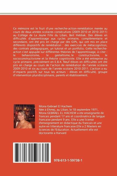 Ce mémoire est le fruit d'une recherche-action-remédiation menée au cours de deux années scolaires consécutives (2009-2010 et 2010-2011) au Collège de La Jeune Fille du Liban, Beit Hebbak. Des élèves en difficultés d'apprentissage aux cycles primaire, complémentaire et secondaire, ont été pris en charge par des GIPs, qui ont mis en place différents dispositifs de remédiation : des exercices de métacognition, des contrats pédagogiques, un tutorat et un portfolio. Cette recherche-action s'est appuyée sur différentes théories de l'apprentissage, à citer : le behaviorisme, le gestaltisme, le constructivisme, le socioconstructivisme et la théorie cognitiviste. Elle a été entreprise au cycle primaire, précisément en E.B.4. Neuf élèves en difficultés ont été pris en charge au cours de l'action de remédiation de l'année scolaire 2009-2010 et six au cours de l'année scolaire 2010-2011. L'action a eu d'impacts positifs sur tous les acteurs : élèves en difficulté, groupe d'intervention pluridisciplinaire, parents et établissement.