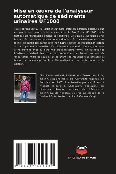 Travail comparatif sur le sédiment urinaire entre les données obtenues sur une plateforme automatisée, le cytomètre de flux Roche UF 1000, et la méthode de microscopie optique de référence. Ce travail a été réalisé avec des données brutes de patients connus dont les résultats attendus nous ont permis de définir les paramètres non pathologiques de l'échantillon obtenu sur l'équipement automatisé. L'expérience a été enrichissante, car nous avons travaillé avec du personnel de laboratoire formé, en utilisant des directives standardisées pour la préparation de l'urine en vue de l'observation microscopique et en obtenant des résultats très efficaces et fiables. Le nouveau protocole a été appliqué aux rapports reçus par le médecin.