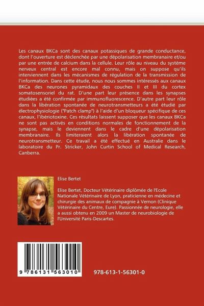 Les canaux BKCa sont des canaux potassiques de grande conductance, dont l''ouverture est déclenchée par une dépolarisation membranaire et/ou par une entrée de calcium dans la cellule. Leur rôle au niveau du système nerveux central est encore mal connu, mais on suppose qu''ils interviennent dans les mécanismes de régulation de la transmission de l''information. Dans cette étude, nous nous sommes intéressés aux canaux BKCa des neurones pyramidaux des couches II et III du cortex somatosensoriel du rat. D''une part leur présence dans les synapses étudiées a été confirmée par immunofluorescence. D''autre part leur rôle dans la libération spontanée de neurotransmetteurs a été étudié par électrophysiologie ("Patch clamp") à l''aide d''un bloqueur spécifique de ces canaux, l''ibériotoxine. Ces résultats laissent supposer que les canaux BKCa ne sont pas activés en conditions normales de fonctionnement de la synapse, mais le deviennent dans le cadre d''une dépolarisation membranaire. Ils limiteraient alors la libération spontanée de neurotransmetteur. Ce travail a été effectué en Australie dans le laboratoire du Pr. Stricker, John Curtin School of Medical Research, Canberra.