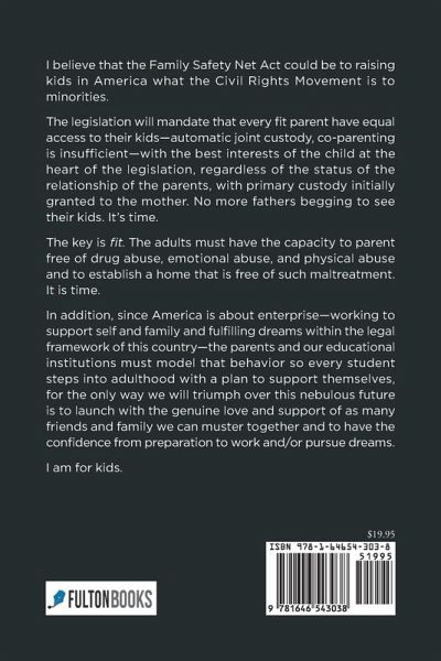 I believe that the Family Safety Net Act could be to raising kids in America what the Civil Rights Movement is to minorities. The legislation will mandate that every fit parent have equal access to their kids-automatic joint custody, co-parenting is insufficient-with the best interests of the child at the heart of the legislation, regardless of the status of the relationship of the parents, with primary custody initially granted to the mother. No more fathers begging to see their kids. It's time. The key is fit. The adults must have the capacity to parent free of drug abuse, emotional abuse, and physical abuse and to establish a home that is free of such maltreatment. It is time. In addition, since America is about enterprise-working to support self and family and fulfilling dreams within the legal framework of this country-the parents and our educational institutions must model that behavior so every student steps into adulthood with a plan to support themselves, for the only way we will triumph over this nebulous future is to launch with the genuine love and support of as many friends and family we can muster together and to have the confidence from preparation to work and/or pursue dreams. I am for kids.