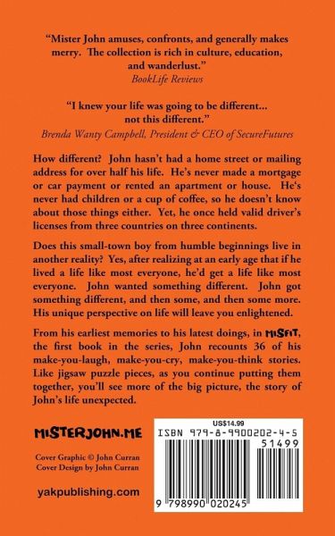 "I knew your life was going to be different... not this different." Brenda Wanty Campbell, President & CEO of SecureFutures How different? John hasn't had a home street or mailing address for over half his life. He's never made a mortgage or car payment or rented an apartment or house. He's never had children or a cup of coffee, so he doesn't know about those things either. Yet, he once held valid driver's licenses from three countries on three continents. Does this small-town boy from humble beginnings live in another reality? Yes, after realizing at an early age that if he lived a life like most everyone, he'd get a life like most everyone. John wanted something different. John got something different, and then some, and then some more. His unique perspective on life will leave you enlightened. From his earliest memories to his latest doings, in MISFIT, the first book in the series, John recounts 36 of his make-you-laugh, make-you-cry, make-you-think stories. Like jigsaw puzzle pieces, once you start putting them together, you'll begin to see the big picture, the story of John's life unexpected.