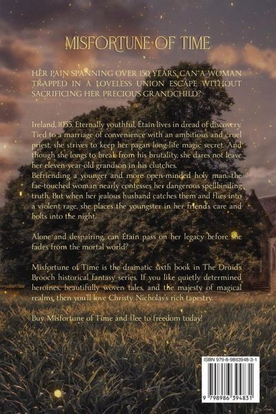 Can a woman trapped in a loveless union escape without sacrificing her precious grandchild? Ireland, 1055. In an ancient realm where time weaves a tapestry of love and loss, a woman trapped in a loveless union must find the strength to break free, even if it means sacrificing everything for her precious grandchild. Étaín, forever locked in a youthful facade, lives in perpetual anguish, concealing her pagan long-life magic from her ambitious and malevolent priest-husband. Though her heart yearns to escape his clutches, she cannot abandon her eleven-year-old grandson to his tyranny. When a kindred spirit, a young and open-minded holy man, enters her life, Étaín is tempted to reveal her perilous truth. Yet, when her jealous husband discovers their connection and unleashes a storm of violence, she makes a fateful decision. Entrusting her beloved grandson to the care of her newfound ally, she flees under the cloak of night. Alone and consumed by despair, Étaín embarks on a race against time, seeking to pass on her ancient legacy before her ethereal existence fades into the annals of history. Misfortune of Time is the sixth chapter in The Druid's Brooch historical fantasy series. In the rich tapestry woven by Christy Nicholas, you will discover the beauty of resilience and the power of destiny. Read Misfortune of Time and lose yourself in a world of captivating heroines, masterfully crafted narratives, and the allure of magical realms. Each book in The Druid's Brooch series can be read in any order as a standalone historical fantasy, allowing you to embark on any mesmerizing journey that calls to your soul.