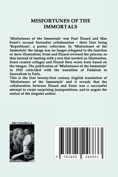'Misfortunes of the Immortals' was Paul Éluard and Max Ernst's second Surrealist collaboration - their first being 'Repetitions', a poetry collection. In 'Misfortunes of the Immortals' the image was no longer relegated to the function of mere illustration; Ernst and Éluard reversed the process, so that instead of starting with a text that needed an illustration, Ernst created collages and Éluard then wrote texts based on the images. The publication of 'Misfortunes of the Immortals' in 1922 coincided with the transition of Dadaism to Surrealism in Paris. This is the first twenty-first century English translation of 'Misfortunes of the Immortals' and it reveals that the collaboration between Éluard and Ernst was a successful attempt to create surprising juxtapositions, and to negate the notion of the singular author.