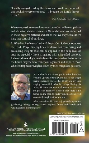 When our passions overtake us-as they often will-compulsive and addictive behaviors can set in. We can become so entrenched in these negative patterns and habits that we may feel as if we have lost control of our lives. In Misguided Passions and the Lord's Prayer, Curt Richards examines the Lord's Prayer line by line and draws out comforting and reassuring insights that can be applied to the daily lives of anyone, especially those struggling with misguided passions. Richards shines a light on the beautiful universal truths found in the Lord's Prayer and offers encouragement and hope to those who feel trapped or weighed down by their misguided passions. "In Misguided Passions and the Lord's Prayer, Curt Richards examines this message by carefully dissecting the Lord's Prayer and relating it to real-life scenarios. The story starts with a man being tempted to steal and gradually getting enticed to steal more because of the feeling of "false pleasure" in it. In his book, he discusses how these behaviors influence our emotions, creating an uncontrollable passion that leads to sin. This uncontrollable passion is very toxic, and the roots of addiction come about from sin, including any possible mental health issues of the individual. Curt's book provides an accurate insight into the Bible, breaking down the Lord's Prayer and dissecting every line to its meaning. He gives the reader a better breakdown and grasp of God's plan and purpose and our duty to evangelize the gospel to the unsaved. I endorse Curt's work and look forward to one day having the opportunity to ask questions and learn more about the details of the Bible." -Robert Cooper secondary science instructor Houston, Texas "I really enjoyed reading this book and would recommend this book for everyone to read-it brought the Lord's Prayer to life. Curt Richards does this by not only providing historical connections but also aligning the message of the Lord's Prayer to our time. In addition, Curt breaks the prayer into parts, which gives an in-depth insight into its meaning. This is an easy-to-read book that gives a feeling of comfort." -Dr. Natasha Cox-Magno"