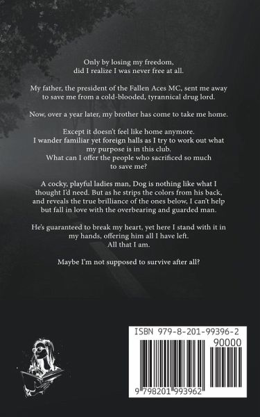 Only by losing my freedom, did I realize I was never free at all. My father, the president of the Fallen Aces MC, sent me away to save me from a cold-blooded, tyrannical drug lord. Now, over a year later, my brother has come to take me home. Only it doesn't feel like home anymore. What can I, a club princess, offer the people who sacrificed so much to save me? A cocky, playful ladies man, Dog is not the hero I expected. But as he strips the colors from his back, and reveals the true brilliance of the ones below, I can't help but fall in love with the dedicated and guarded man. He's guaranteed to break my heart, yet here I stand with it in my hands, offering him all I have left. All that I am. Maybe I'm not supposed to survive after all?