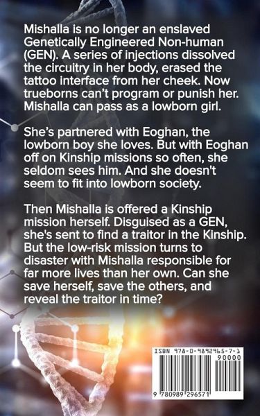 Mishalla is no longer an enslaved Genetically Engineered Non-human (GEN). A series of injections dissolved the circuitry in her body and erased the tattoo interface from her cheek. Now trueborns can't program or punish her. Mishalla can pass as a lowborn girl. She's partnered with Eoghan, the lowborn boy she loves. But with Eoghan off on Kinship missions so often, she seldom sees him. And she doesn't seem to fit into lowborn society. Then Mishalla is offered a Kinship mission herself. Disguised as a GEN, she's sent to find a traitor in the Kinship. But the low-risk mission turns to disaster with Mishalla responsible for far more lives than her own. Can she save herself, save the others, and reveal the traitor in time? Color edition, a spin-off of the Tankborn Trilogy.